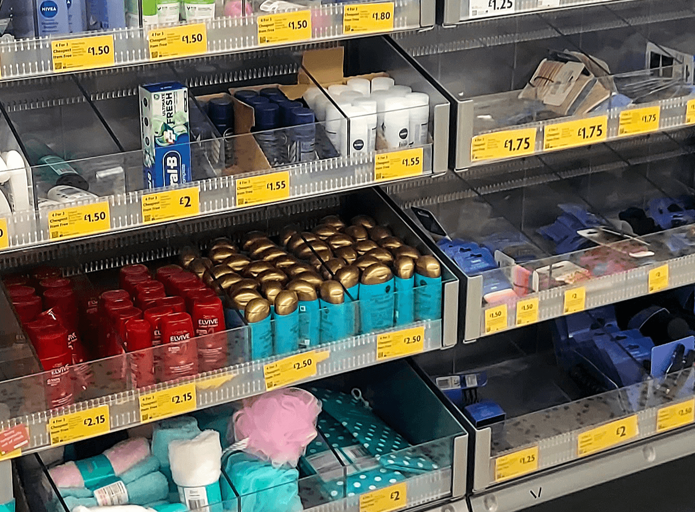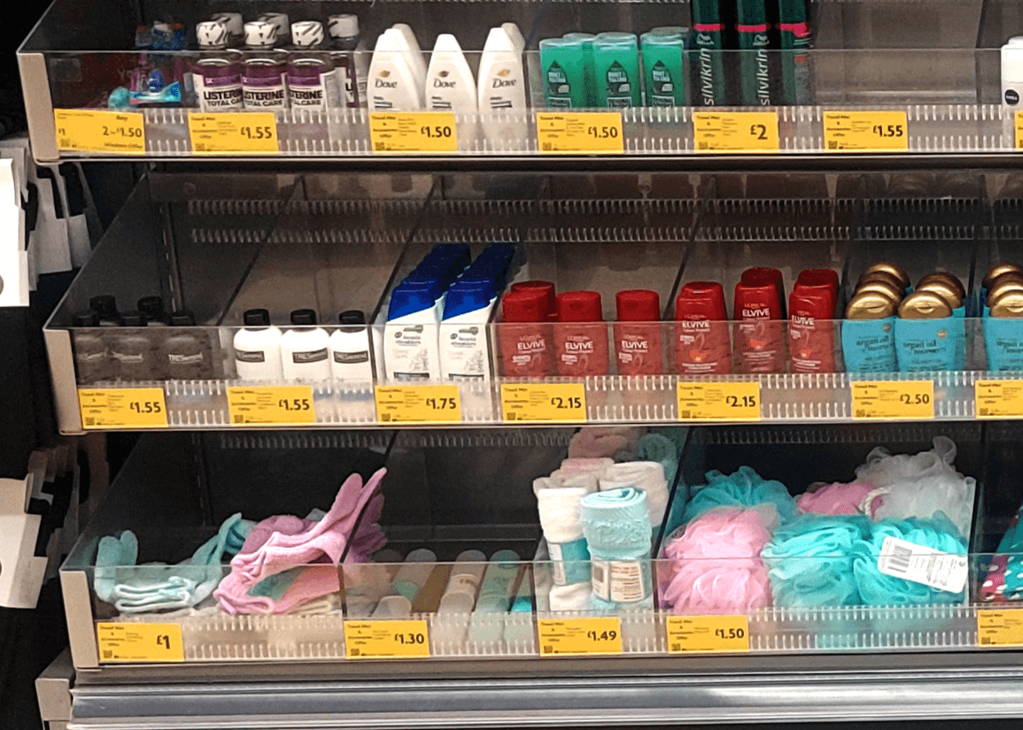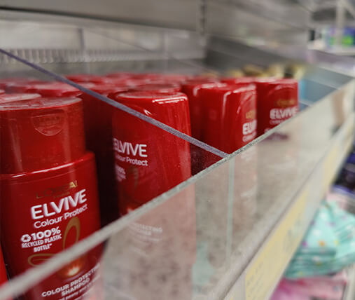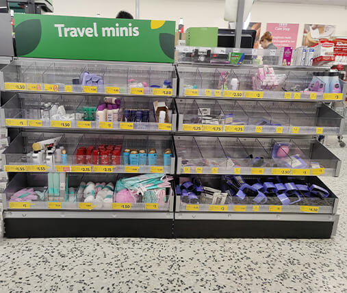 We were tasked with designing and producing impulse display bays for the back of self-service checkouts, aimed at showcasing health and beauty items of various sizes. The solution needed to ensure full product visibility while being compatible with the existing shelf system.